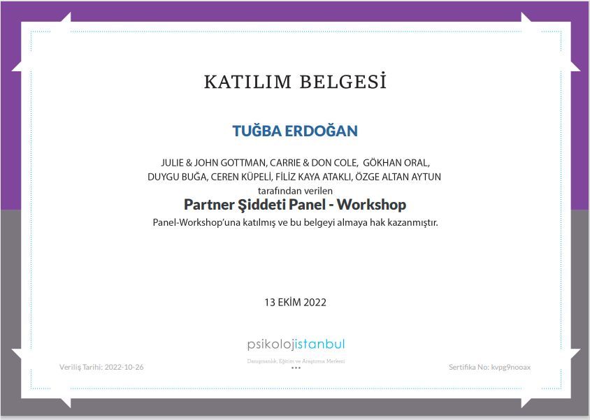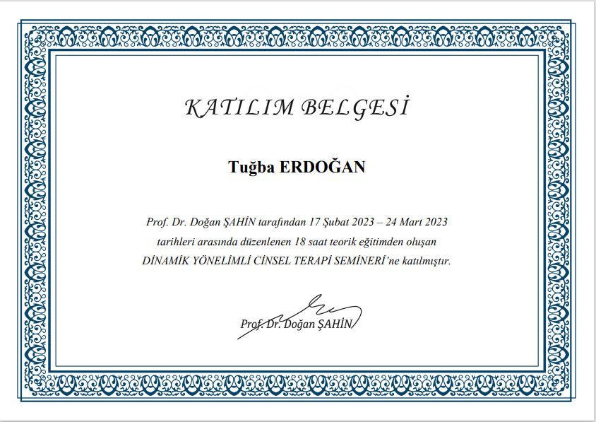 Lisans eğitimimi tamamladıktan sonra gönüllü stajlarımla birlikte kendimi geliştirerek, eğitimler aldım. Çeşitli terapi ekollerine yönelik eğitimler almış olsam da danışanlarım ile Bilişsel Davranışçı terapi çerçevesinde çalışıyorum.